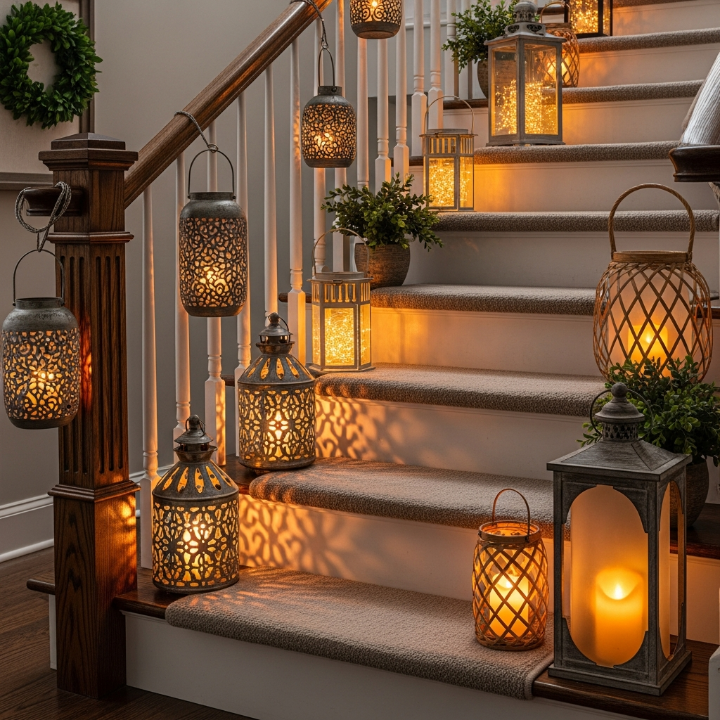 Place lanterns on individual stair treads, especially those with wider steps, or hang them at varying heights alongside the banister. Choose durable, enclosed lanterns in finishes that complement your staircase material, be it dark wood or painted white. The cascading light creates an enchanting, inviting path upwards.