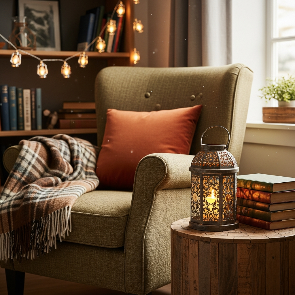 Create the ultimate reading escape by adding a lantern to your favorite nook. A small, intimate lantern placed on a side table next to a plush armchair provides just enough ambient light without being too harsh.