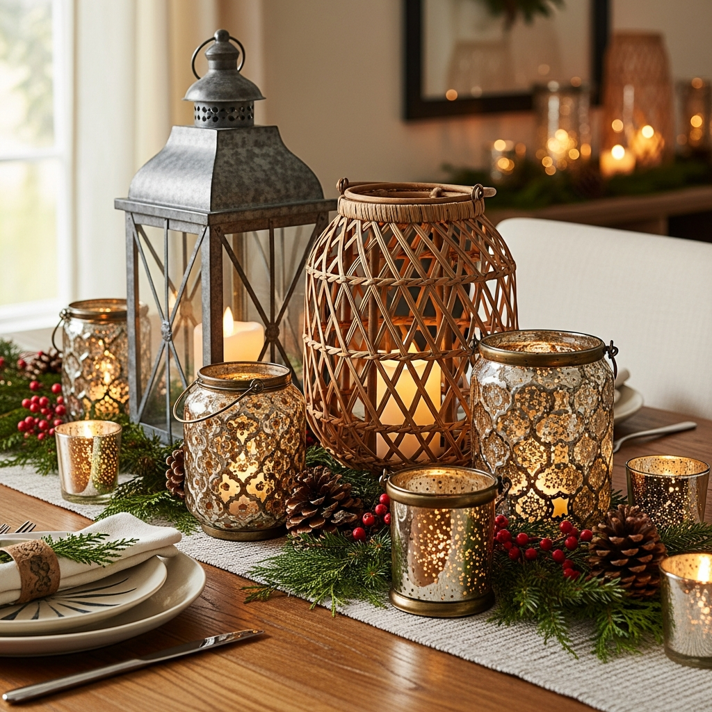 Fill the lantern with fairy lights, small ornaments, or seasonal greenery instead of a candle for a unique twist. Surround it with a beautiful table runner, fresh flowers, and elegant tableware. This arrangement creates a magical focal point that encourages conversation and adds a celebratory, cozy spirit to your meals.