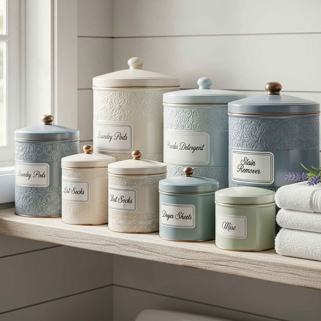 For a touch of vintage charm or industrial chic, decorative metal tins or canisters are perfect for storing detergent pods or powder. They come in various finishes and designs.