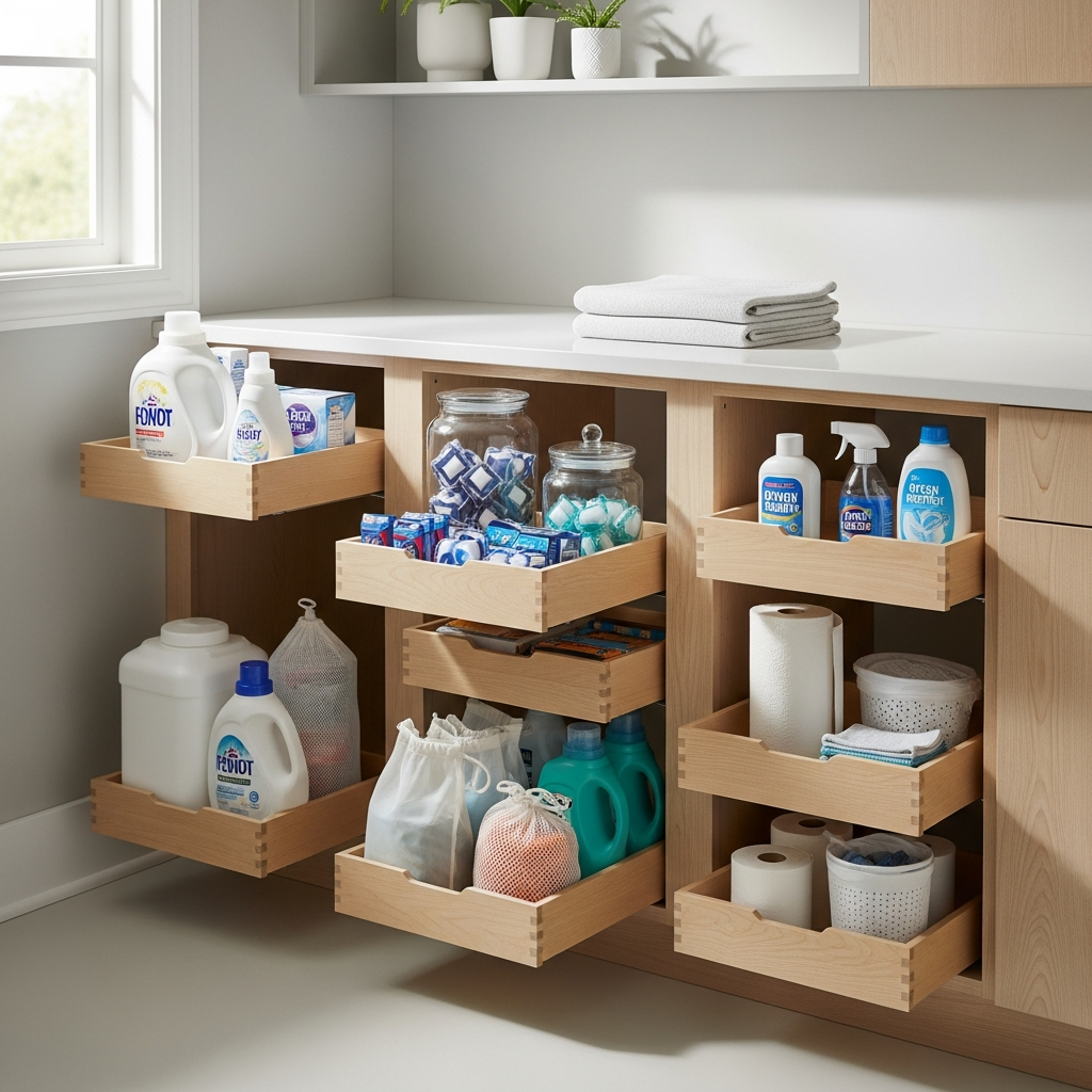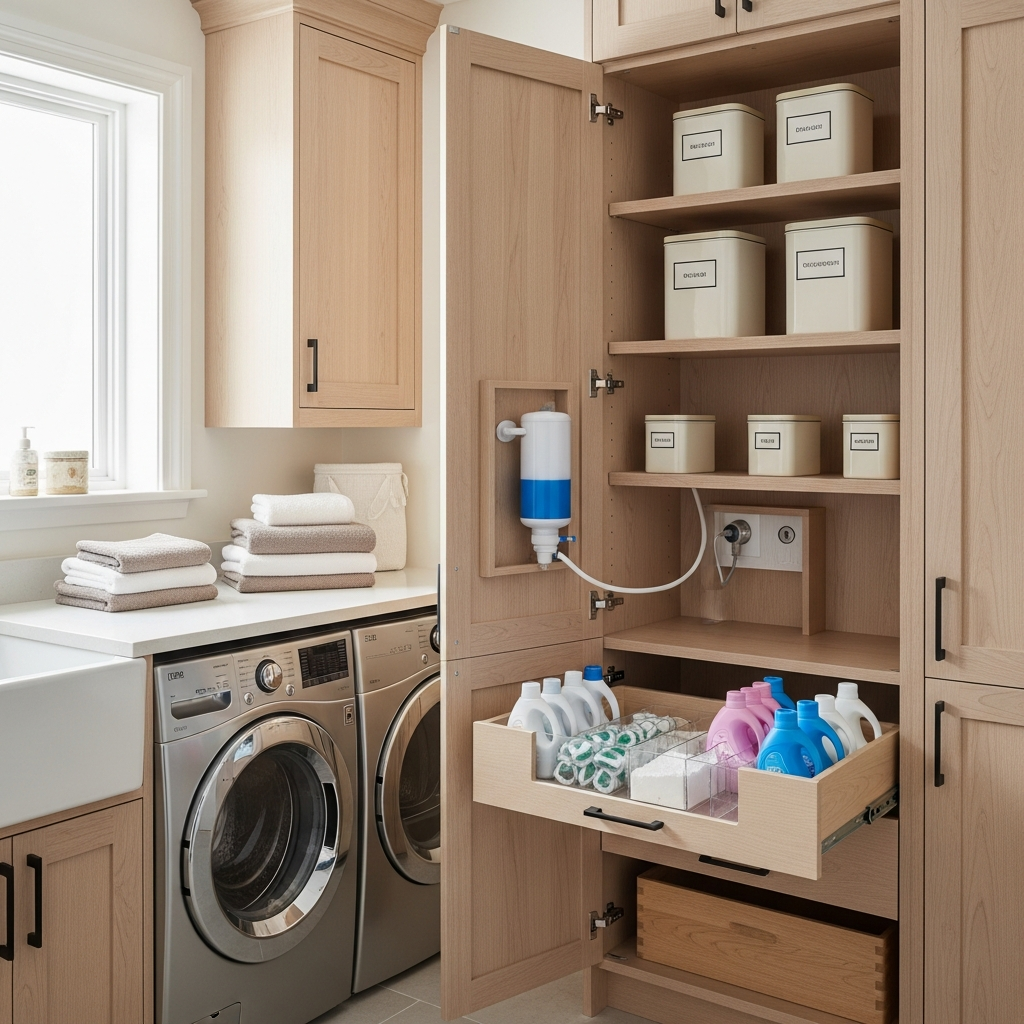 Custom cabinetry is the epitome of integrated design, offering seamless storage that disappears when not in use. Pull-out trays within these cabinets make accessing even the heaviest detergents effortless.