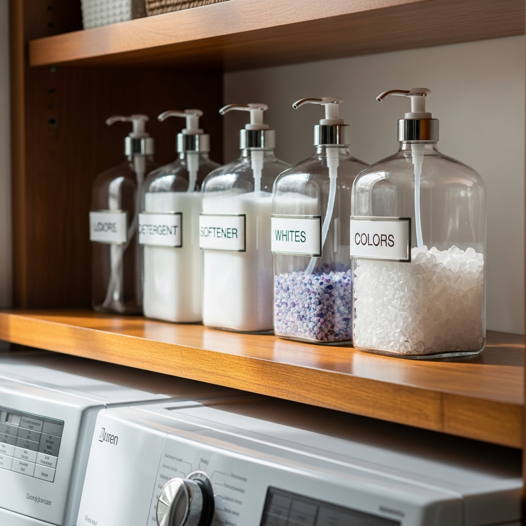 Imagine a countertop that feels more like a spa than a utility room. Clear glass dispensers are a fantastic way to achieve this sophisticated look. Opt for sleek, tall dispensers with a pump or pour spout for liquid detergent and smaller, wider jars for pods or powder.