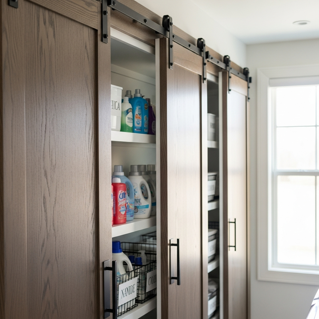 If your laundry area is in a visible part of your home, a sliding barn door can artfully conceal all your supplies, including detergent, behind a stylish facade.