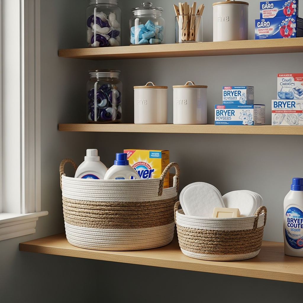 For a touch of warmth and texture, woven baskets are an excellent choice. They beautifully conceal less attractive packaging while adding an organic element to your laundry area.
