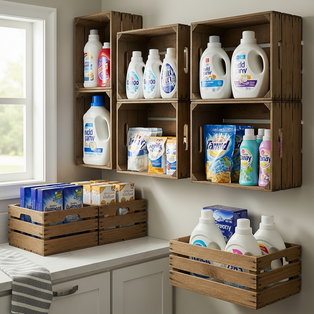 For a truly unique and eco-conscious storage solution, consider repurposing vintage wooden crates. They add character and a story to your laundry space.