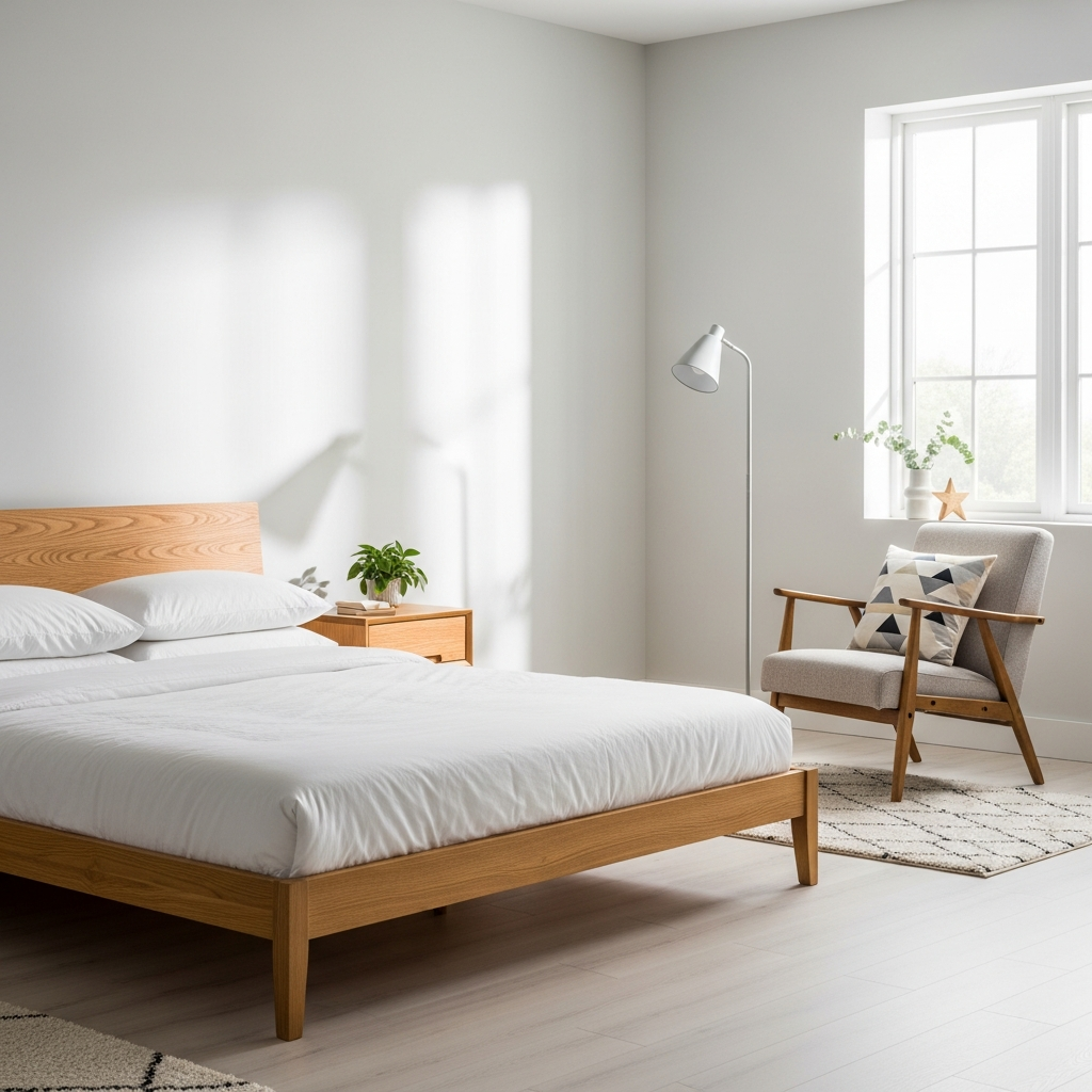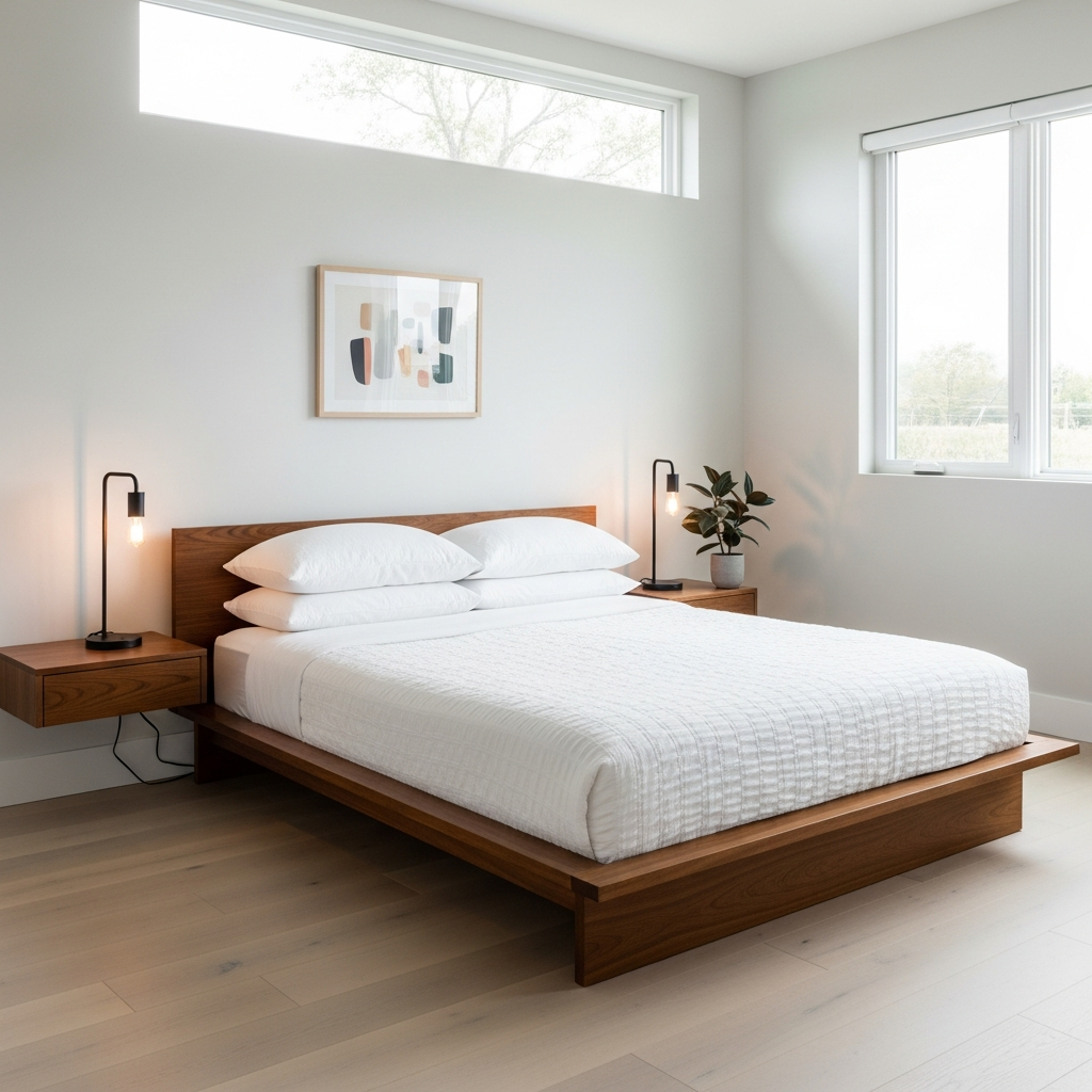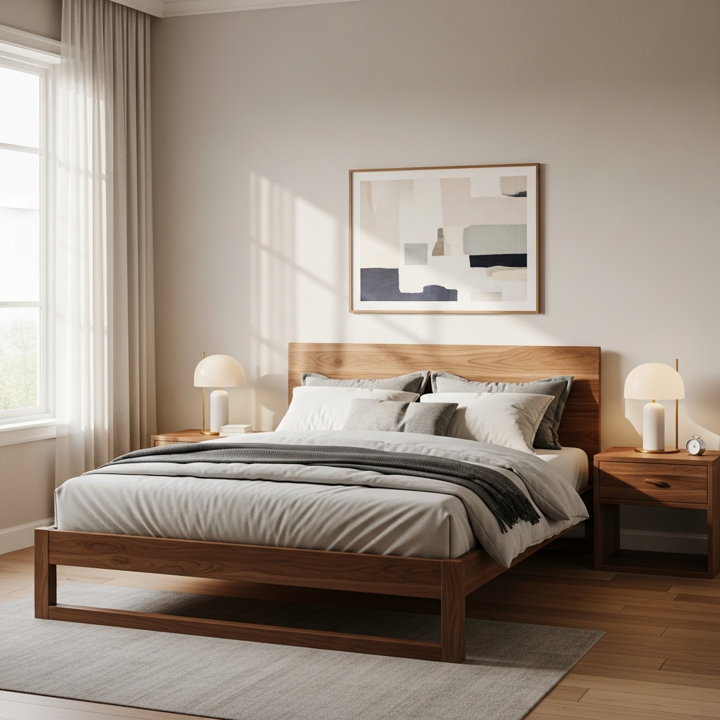 Embrace the enduring beauty of walnut wood. A low-slung walnut platform bed paired with matching tapered-leg nightstands instantly sets a sophisticated tone. Keep the bedding in crisp whites or soft creams to let the rich wood grain truly shine. Add a minimalist brass lamp for a touch of refined sparkle.