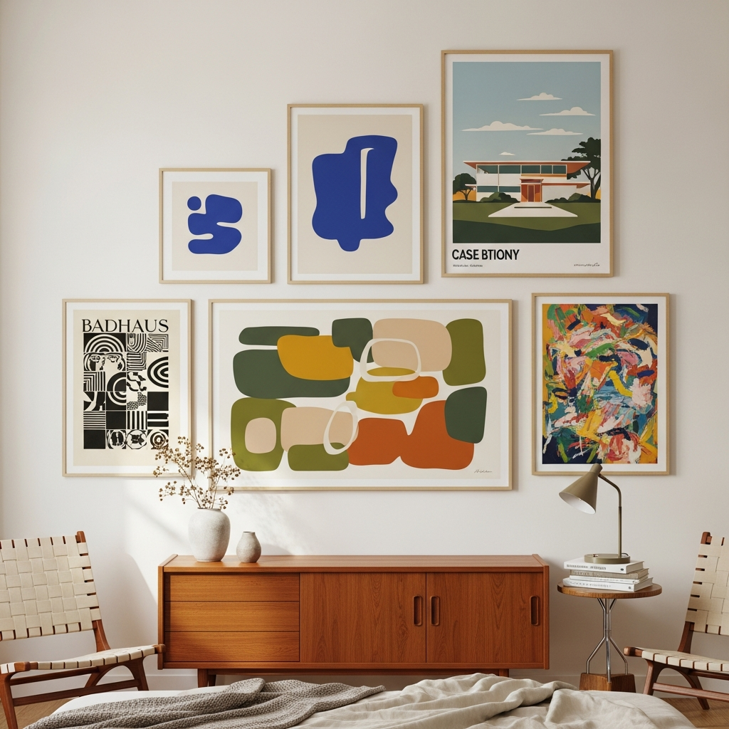 Turn a bedroom wall into a curated gallery of abstract midcentury art. Choose prints with bold colors and geometric shapes, framed in simple wood or brass. This adds personality and a focal point, reflecting the era’s appreciation for fine art and design.