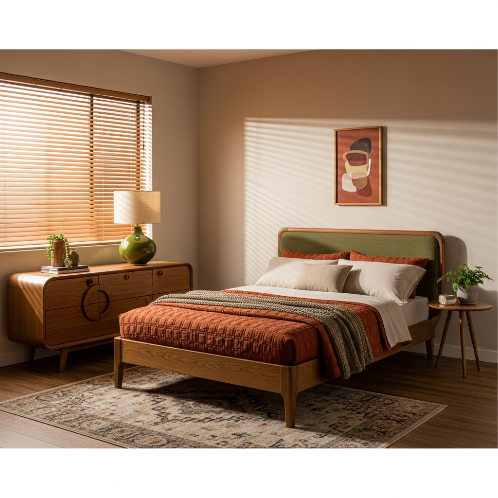 Draw inspiration from nature with a palette of olive green, terracotta, and warm browns. Choose furniture with gentle curves, like a rounded headboard or an organically shaped accent chair. Incorporate natural textures through wool rugs and linen bedding for an inviting, grounded feel.