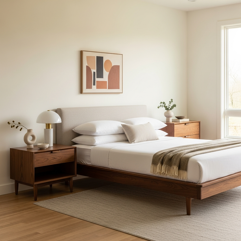 A definitive midcentury staple is the platform bed. Opt for a low-profile design in dark walnut or teak to create a grounded, spacious feel. Keep bedding simple and crisp, allowing the bed’s architectural lines to be the star. Minimalist art above the headboard enhances the effect.
