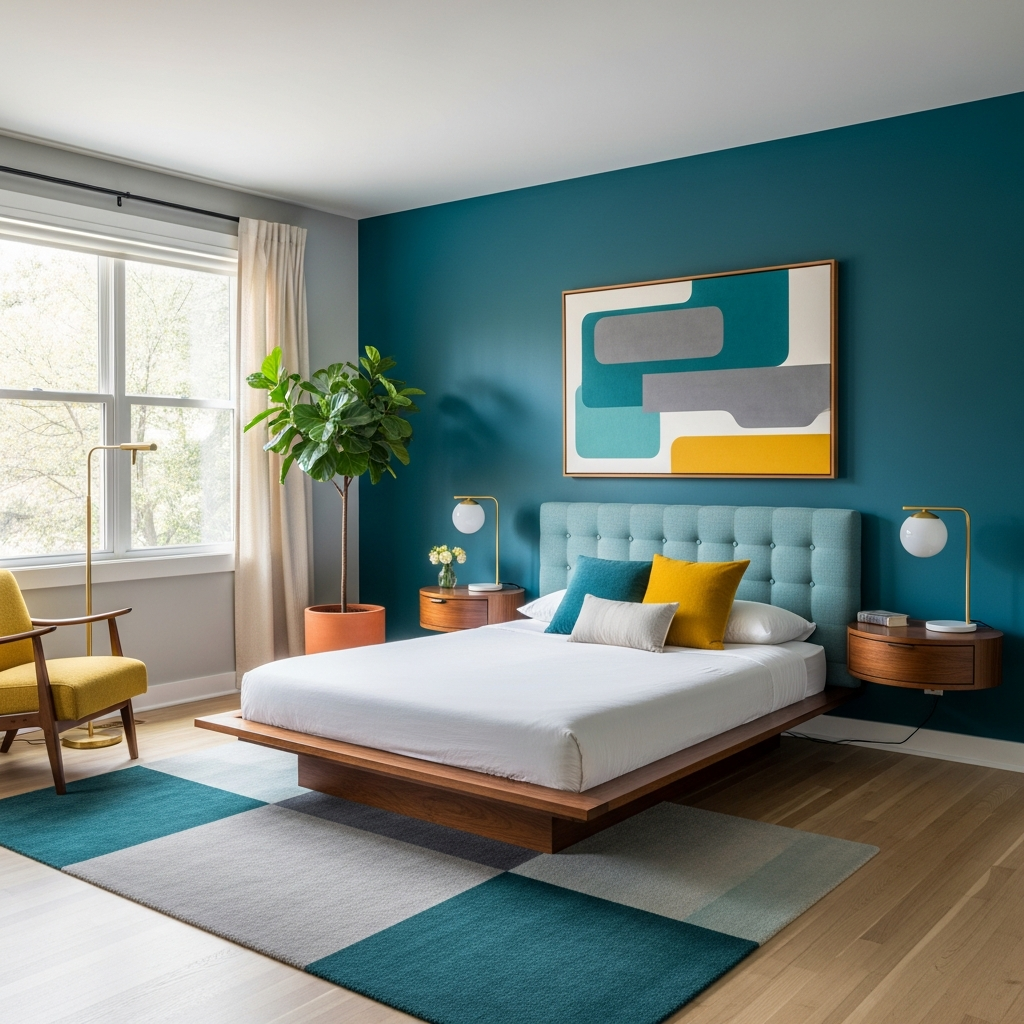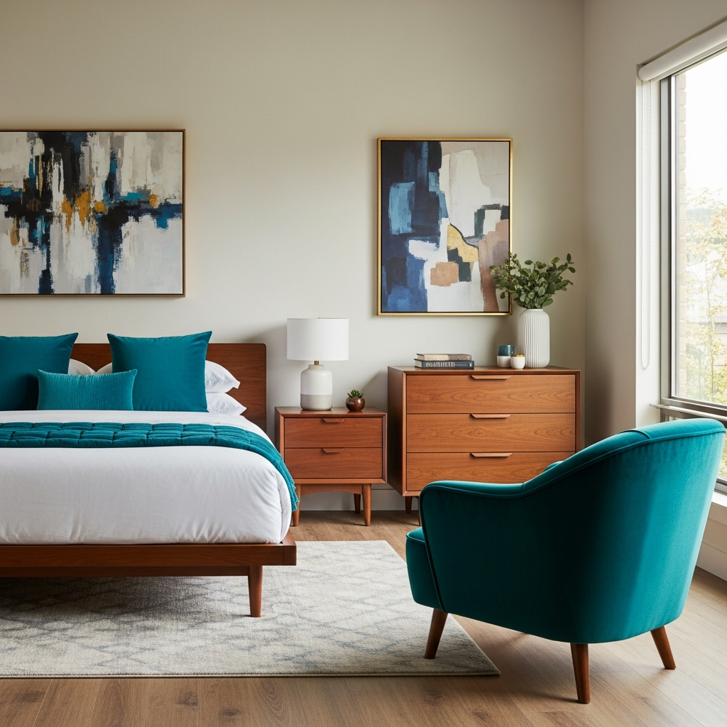 Introduce a deep teal through a plush velvet headboard or a statement accent chair. This jewel tone pairs beautifully with warm woods and brass, offering a luxurious pop of color without overwhelming the space. Keep walls a soft gray or off-white to maintain balance.