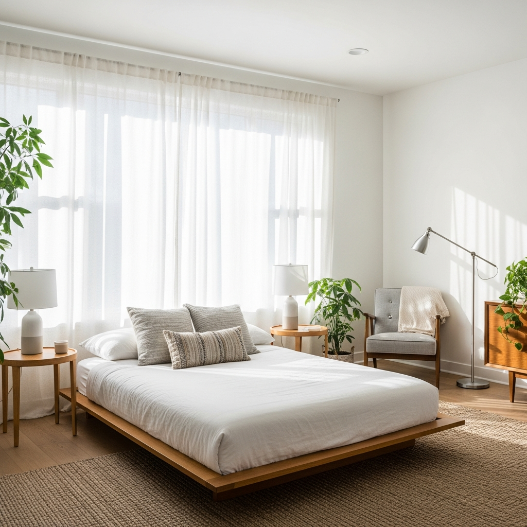Maximize natural light to create a serene, open feel. Use light-colored woods, crisp white or pale gray walls, and sheer curtains. This bright canvas allows key midcentury pieces, like a classic dresser or a sculptural lamp, to stand out without feeling heavy.