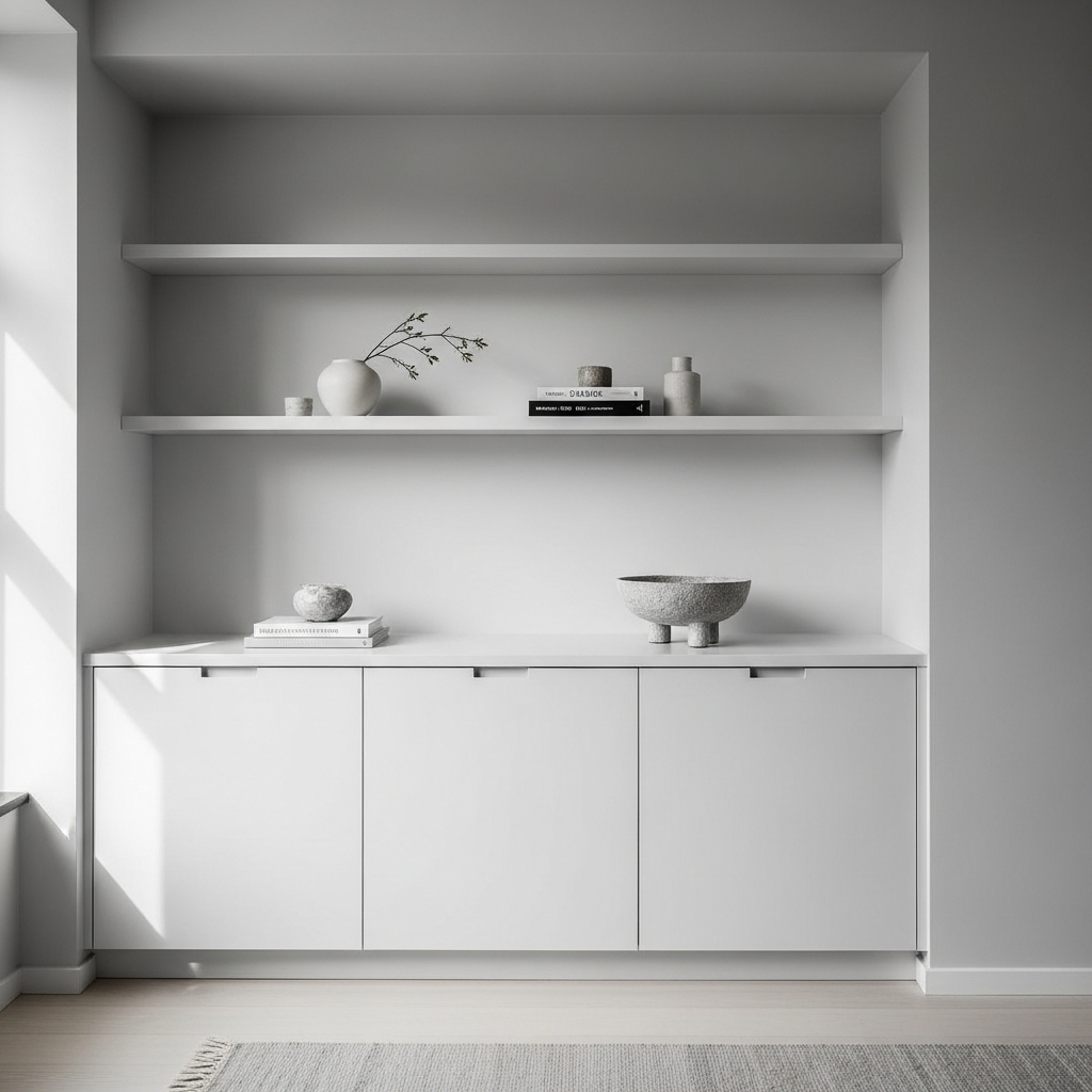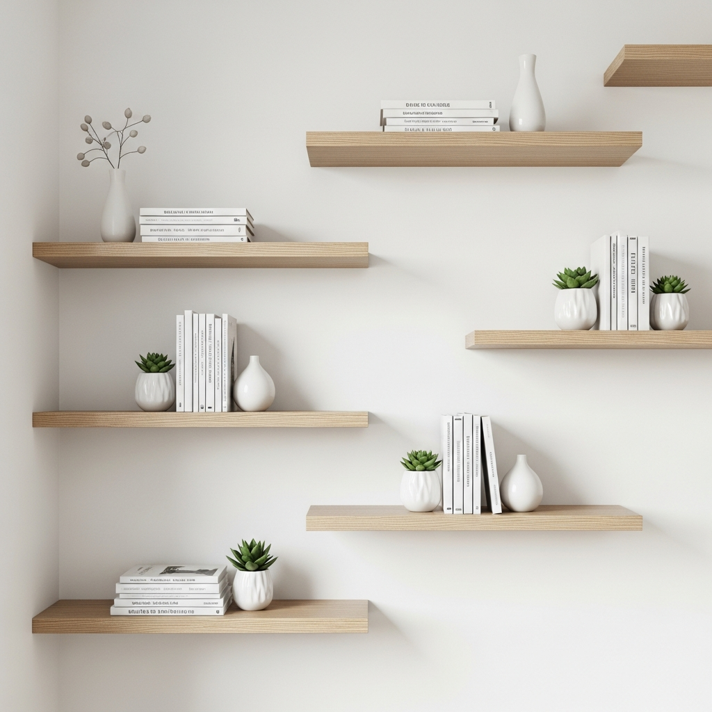 Floating shelves are a minimalist’s best friend. They offer display and storage without the visual weight of traditional bookcases. By keeping the floor clear, they enhance the illusion of space and lightness. Choose shelves in a material that blends with your walls, like white-painted wood or a light natural timber, to maintain a clean aesthetic.