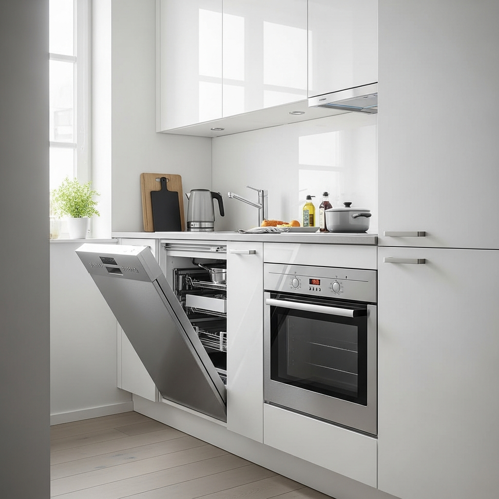 In a small kitchen, choosing compact and multi-functional appliances is key. Think sleek, narrow dishwashers, combination microwave-ovens, or slim refrigerators. Integrated appliances that blend seamlessly with cabinetry further enhance the clean, uncluttered look. Stainless steel or matte white finishes complement the minimalist aesthetic beautifully.