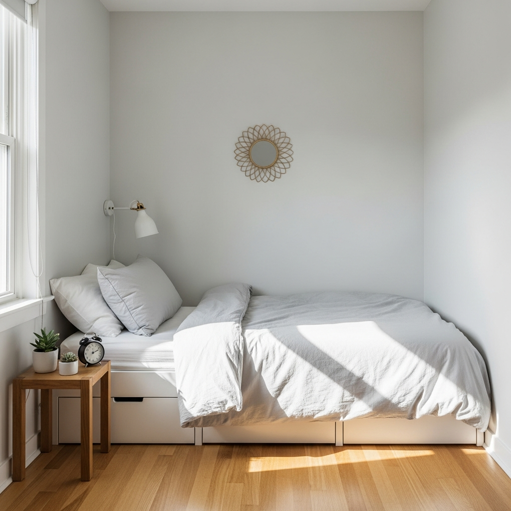 An elevated bed frame with integrated drawers or open shelving underneath transforms often-unused space into valuable storage. This keeps your bedroom floor clear and tidy, reinforcing the minimalist principle of hidden functionality. Choose sleek designs in light woods or upholstered finishes that blend with your decor.