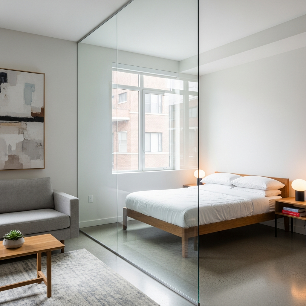 When you need to separate areas without blocking light or flow, glass partitions are an elegant solution. A clear glass screen can define a sleeping nook from a living space, or a small home office. This maintains the visual spaciousness of an open layout while giving each zone its own distinct purpose. Often framed in slim black metal for a modern touch.