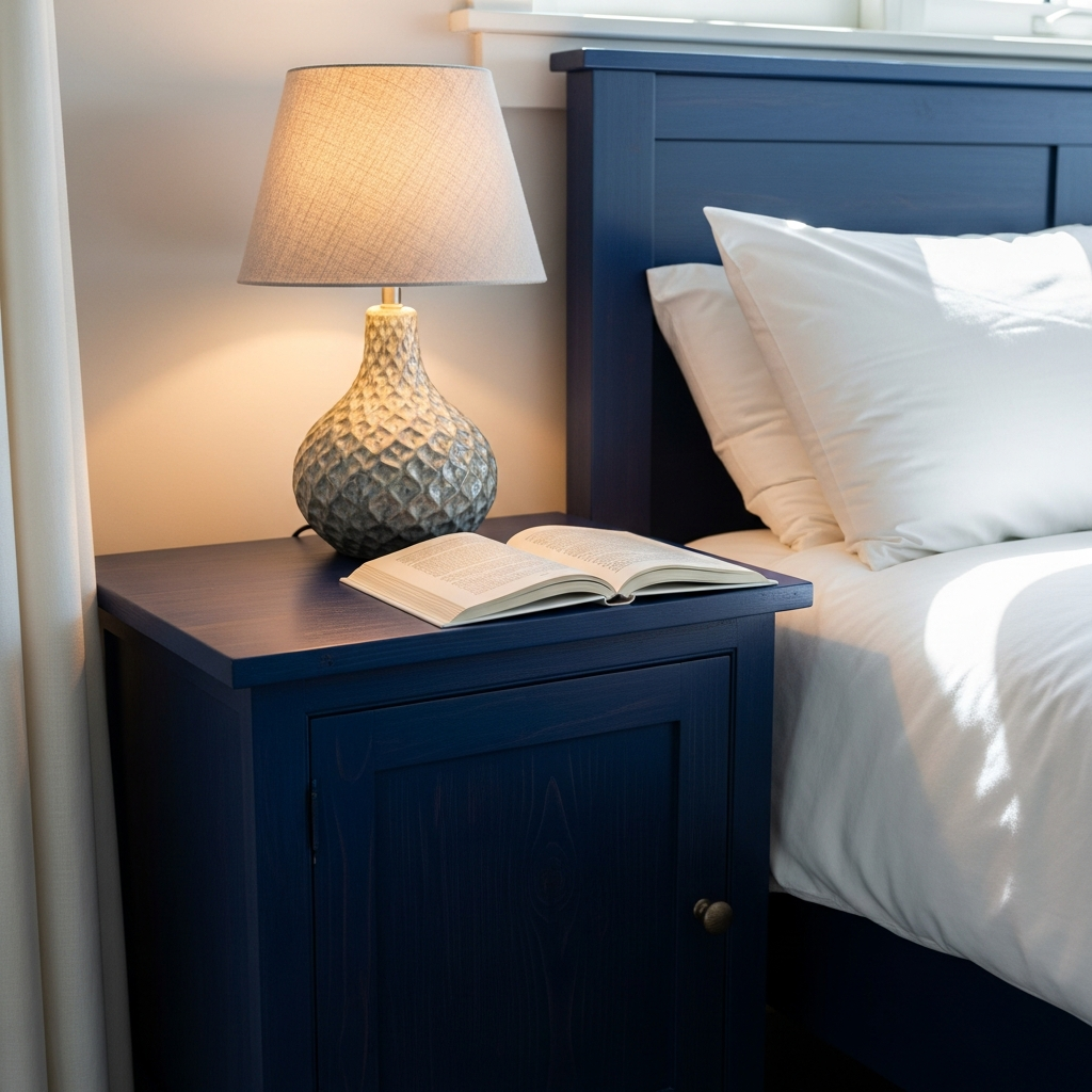 Introduce a pop of color with a bold blue nightstand. Shades like navy, cobalt, or even a serene dusty blue can add depth and personality to your bedroom. This works beautifully with a simple, rectangular nightstand shape, letting the color do all the talking.