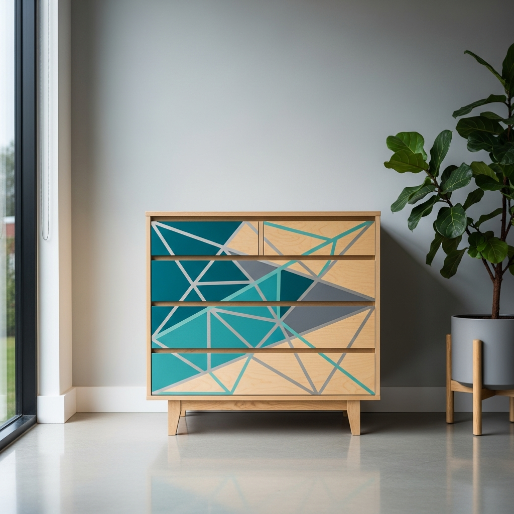 Turn a simple chest into a statement piece with a geometric pattern. Use painter’s tape to create triangles, chevrons, or abstract shapes on the drawer fronts, painting them in contrasting colors like white and gold, or teal and grey.