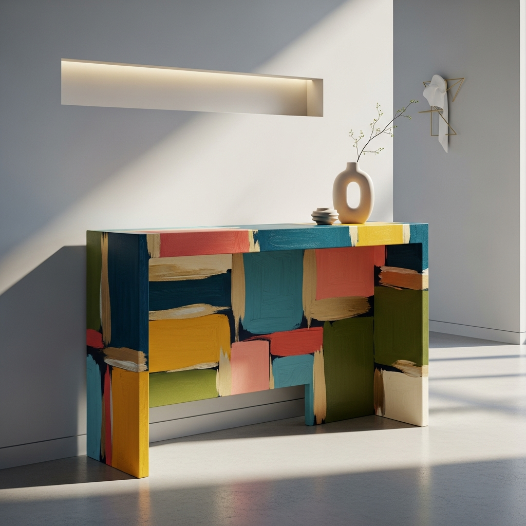 Turn a simple console table into a canvas for abstract art. Use free-form brushstrokes, color blocks, and splatters in a harmonious yet vibrant palette. Think abstract expressionism for your furniture.
