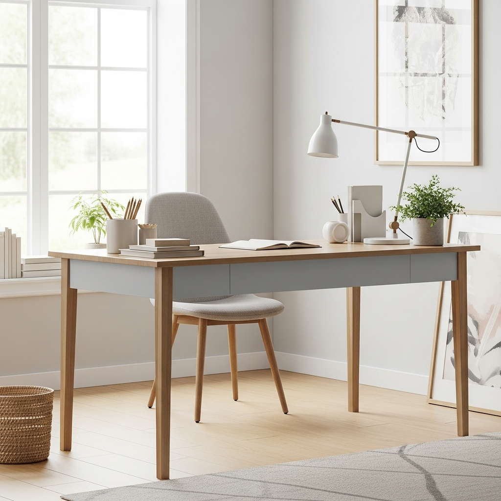 The goal is an uncluttered, serene aesthetic. Pair it with natural wood elements, simple ceramics, and lush greenery. The mood is calm, functional, and effortlessly stylish, promoting focus and tranquility in an office or study.