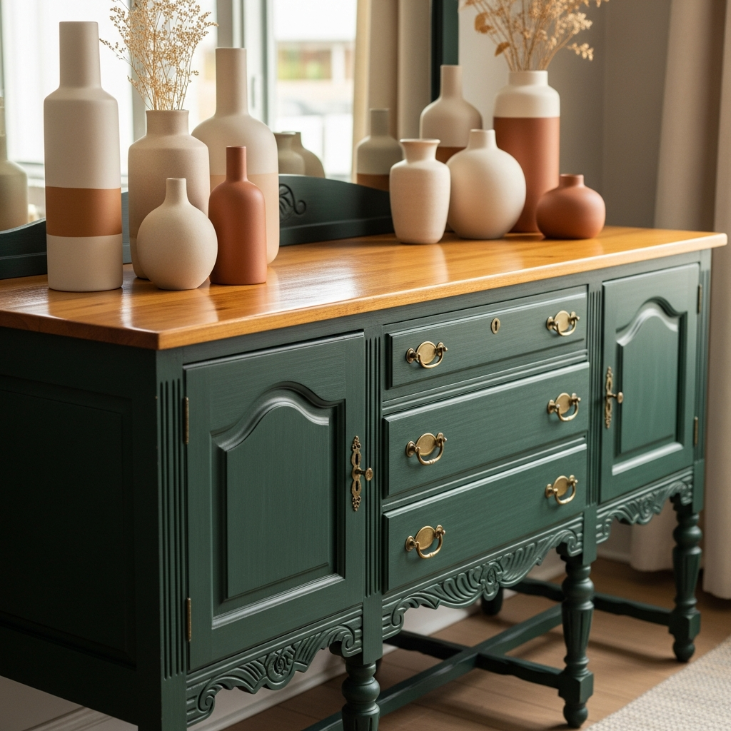 This contrast highlights both the beauty of the wood and the chosen paint color. It works well on rectangular or curvaceous buffet shapes, adding a sense of curated elegance to dining rooms or entryways. The mood is balanced, refined, and grounded.