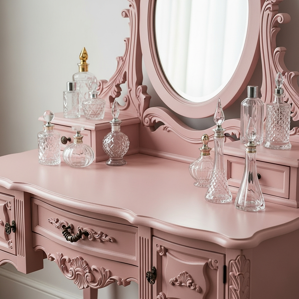 Pair it with a decorative mirror, crystal knobs, and delicate glass accessories. This look evokes a dreamy, nostalgic, and sophisticated mood, ideal for creating a personal sanctuary.