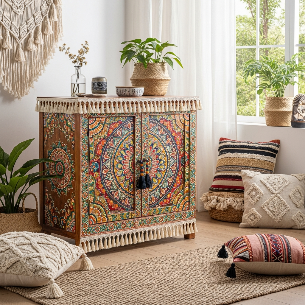 Add fringed tassels or beaded pulls for an authentic touch. This style works best on sturdy, perhaps slightly rustic, furniture pieces and brings an artistic, free-spirited, and exotic mood to your living space.