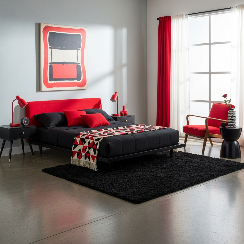 Infuse your bedroom with retro flair, giving mid-century modern a bold red and black update. Ebony black walls or furniture provide a strong foundation, while a retro brick red makes an appearance in a statement armchair or a geometric patterned rug. Walnut wood tones are essential, alongside a splash of mustard yellow for an authentic touch.