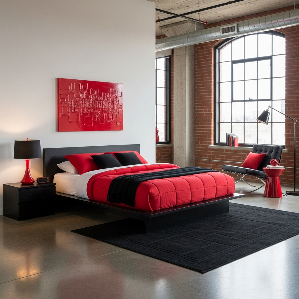 For those who love an urban, edgy aesthetic, red and black translate beautifully into an industrial setting. Picture exposed brick walls, painted a deep barn red, contrasting with charcoal black metal-framed windows or a feature wall. The overall palette includes raw concrete grey and metallic sheens.
