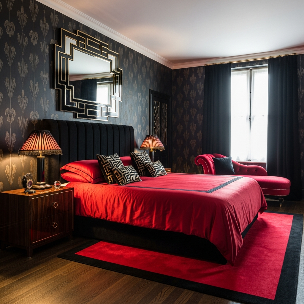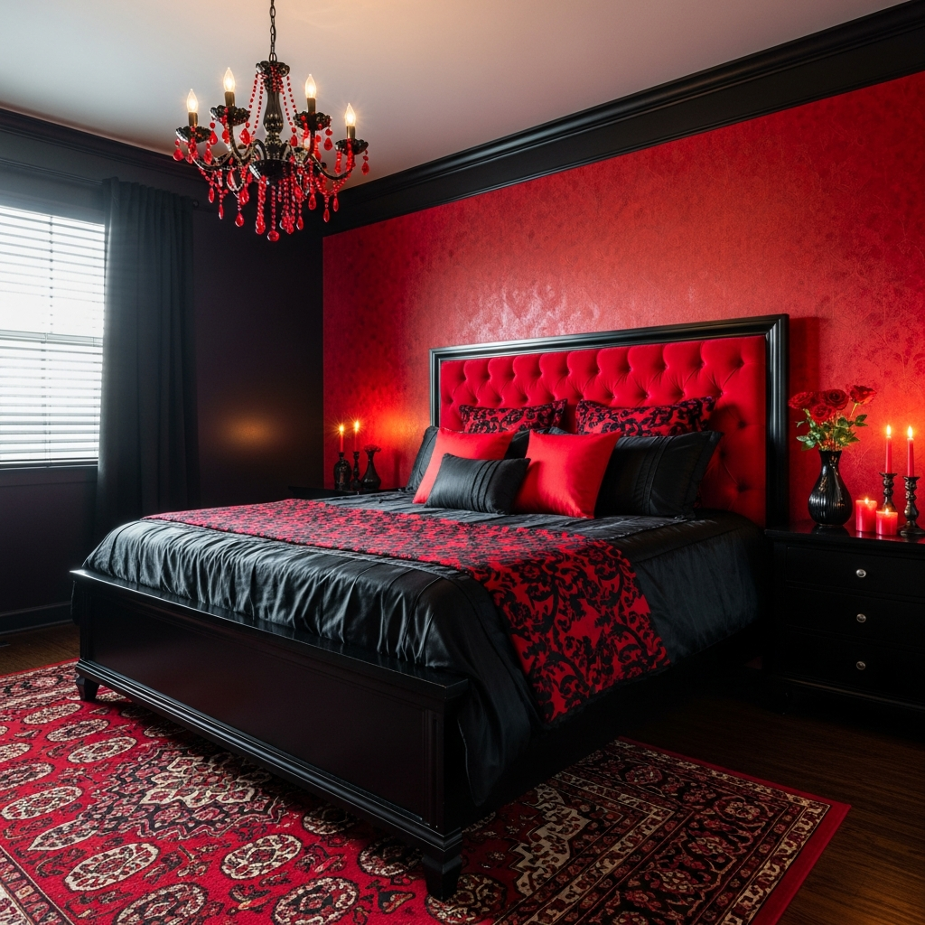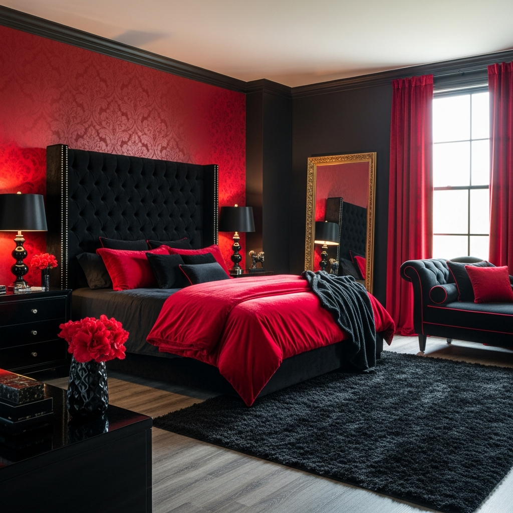 This idea screams luxury and old-world charm, reinterpreted for today. It features glossy black walls or even a striking black wallpaper with a subtle pattern. The red here is a rich, plush velvet, perhaps on a grand tufted headboard or a decadent chaise lounge placed in a corner.