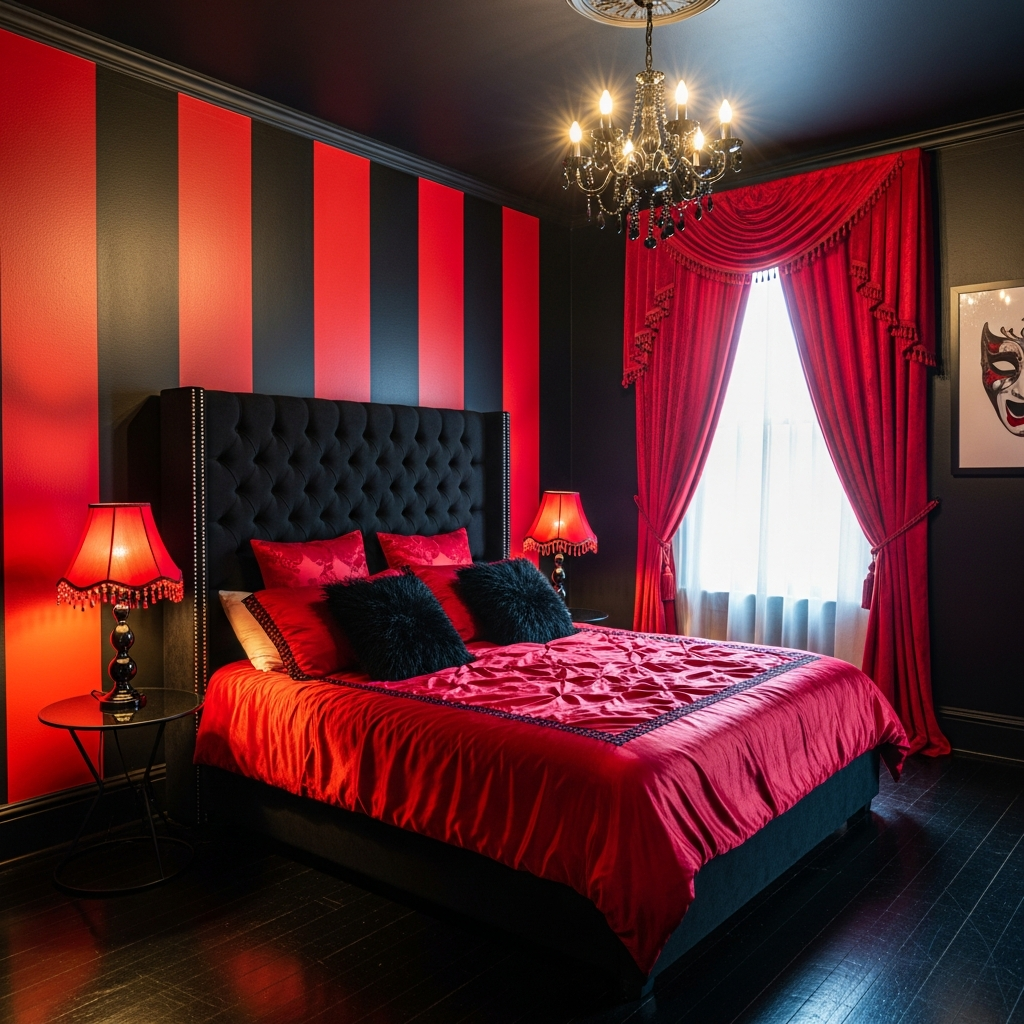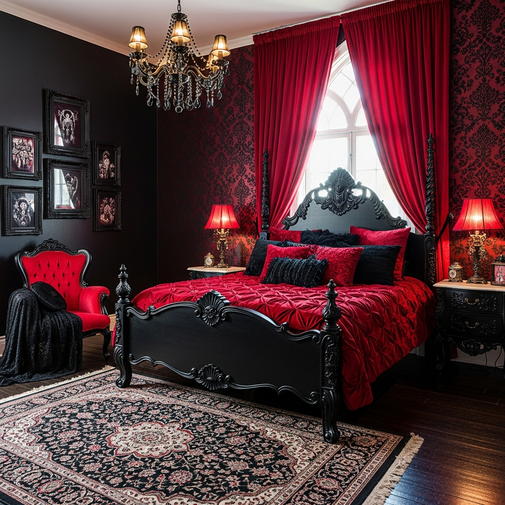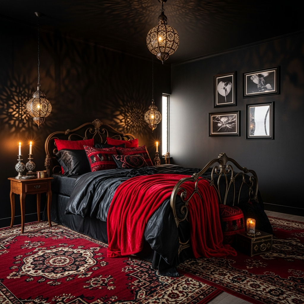 This idea screams luxury and old-world charm, reinterpreted for today. It features glossy black walls or even a striking black wallpaper with a subtle pattern. The red here is a rich, plush velvet, perhaps on a grand tufted headboard or a decadent chaise lounge placed in a corner.
