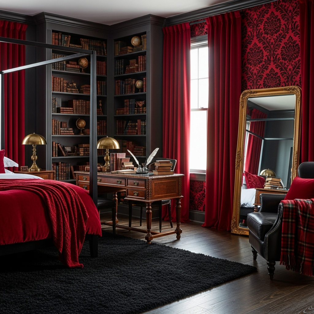 Combine the intellectual charm of dark academia with the bold impact of red and black. Matte black walls create an introspective atmosphere, while oxblood red appears in rich leather or velvet upholstery. Antique brass and dark wood furniture reinforce the scholarly feel.