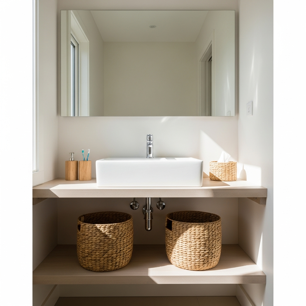 If your vanity has open shelving, stylish baskets are perfect for discreetly stashing essentials. Choose woven textures like rattan or sea grass to add warmth and a touch of organic charm. They keep clutter hidden while adding visual interest.