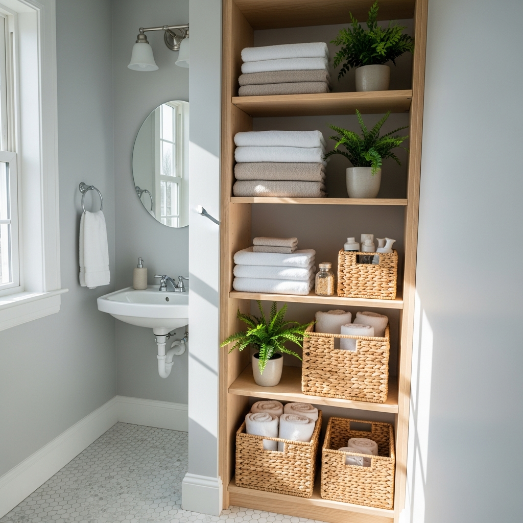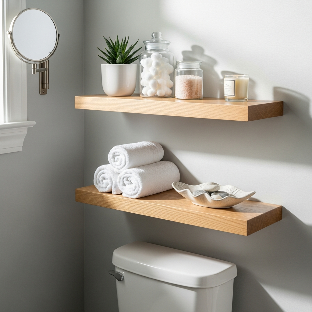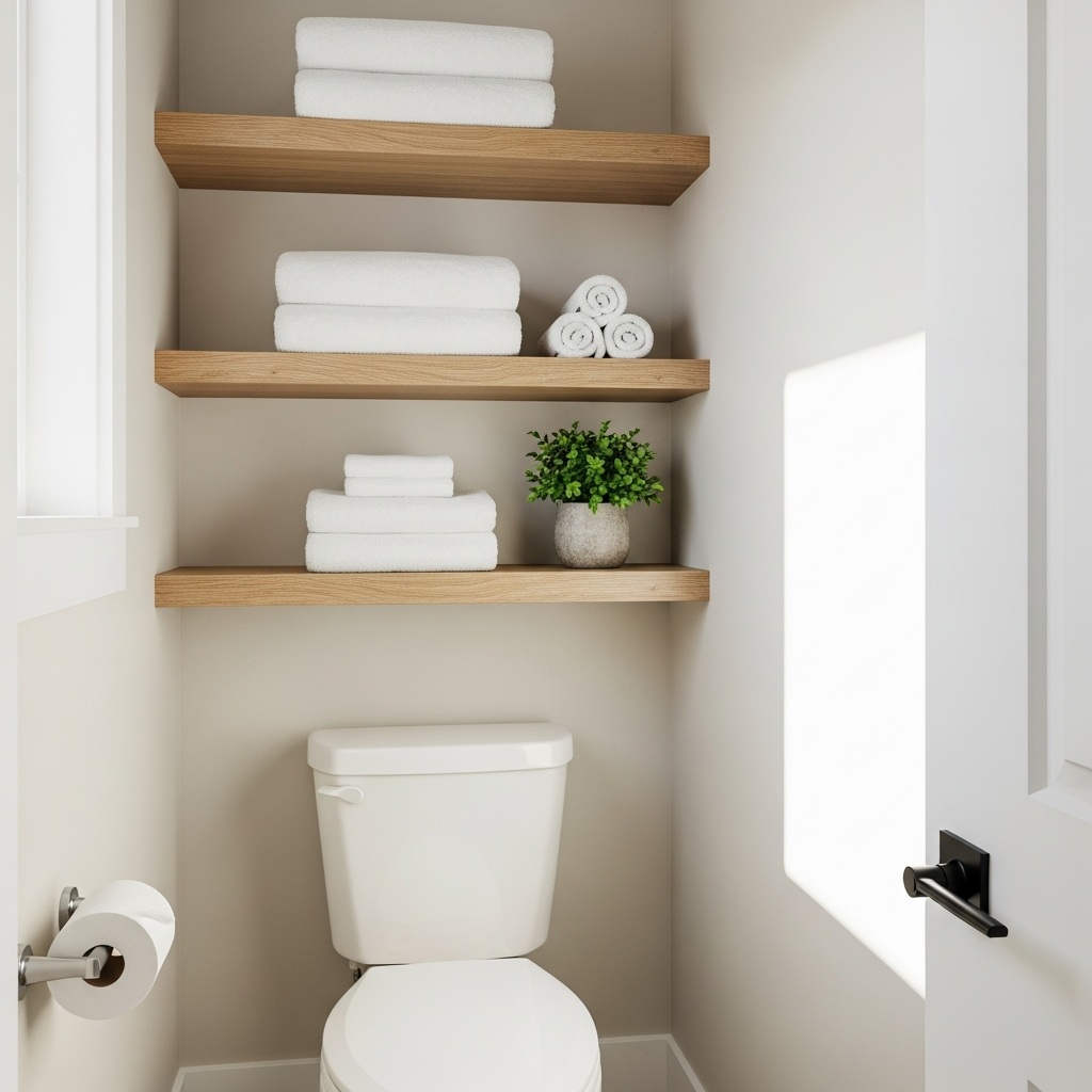 Open shelves, especially above the toilet or next to the vanity, prevent a closed-off feeling. Style them with neatly folded towels, decorative bottles, or a small plant to add personality without clutter. Choose light wood or painted shelves for an airy touch.