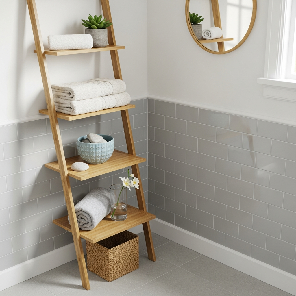 A ladder shelf offers a charming and practical storage solution. Its lean design takes up minimal floor space while providing multiple tiers for towels, baskets, or decorative accents. They introduce a lovely rustic or Scandinavian vibe.