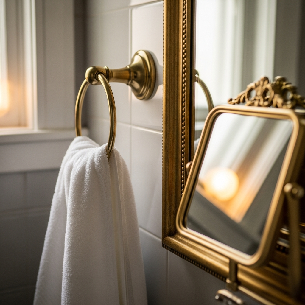 A touch of metallic sheen, whether brass, chrome, or matte black, can elevate a small bathroom. Use it for your faucet, towel hooks, or even a small decorative tray. These reflective surfaces add a luxurious glimmer and draw the eye without adding bulk.
