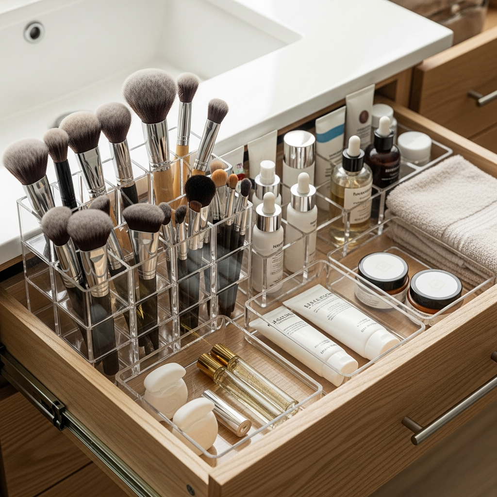 When storage is at a premium, clear acrylic organizers are your best friend. They keep small items tidy on your counter or inside drawers without adding visual clutter. The transparency helps maintain the light and airy feel of the room.