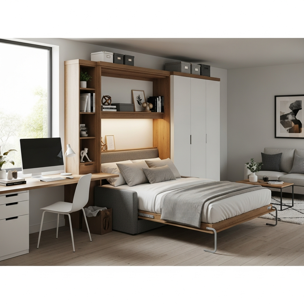 Imagine a crisp, minimalist cabinet in a pale grey or warm birch wood, blending into your wall. When pulled down, the bed reveals soft linen bedding in a soothing natural tone, perhaps with an accent throw in deep teal or mustard. This creates a clean, uncluttered, and highly adaptable environment.