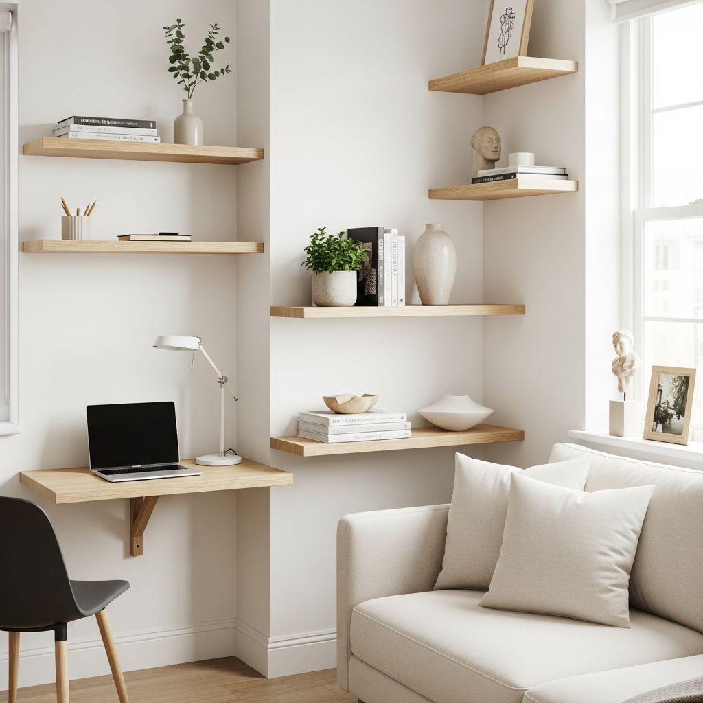 Install a series of natural wood floating shelves above your workspace or sofa. Adorn them with small potted succulents, a few cherished books, and perhaps a framed photograph. This creates a personalized gallery wall without encroaching on your living area.