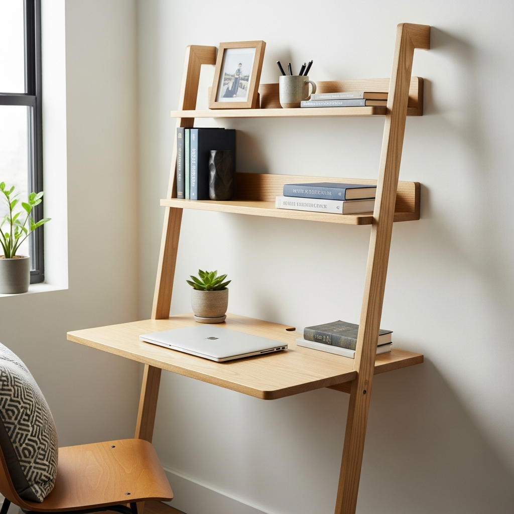 A ladder-style unit leans against the wall, offering a combination of desk space and shelving in a vertical, space-saving design. Its open structure prevents it from feeling bulky in a small room.