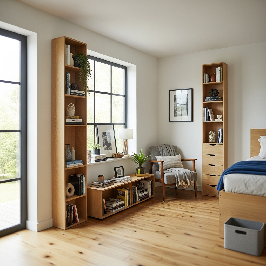 Select a minimalist, tall bookcase in a stark white finish. Its slim profile allows it to fit snugly against a wall without protruding too much. Fill it with books, decorative boxes, and a few small art pieces, creating a curated vertical library.