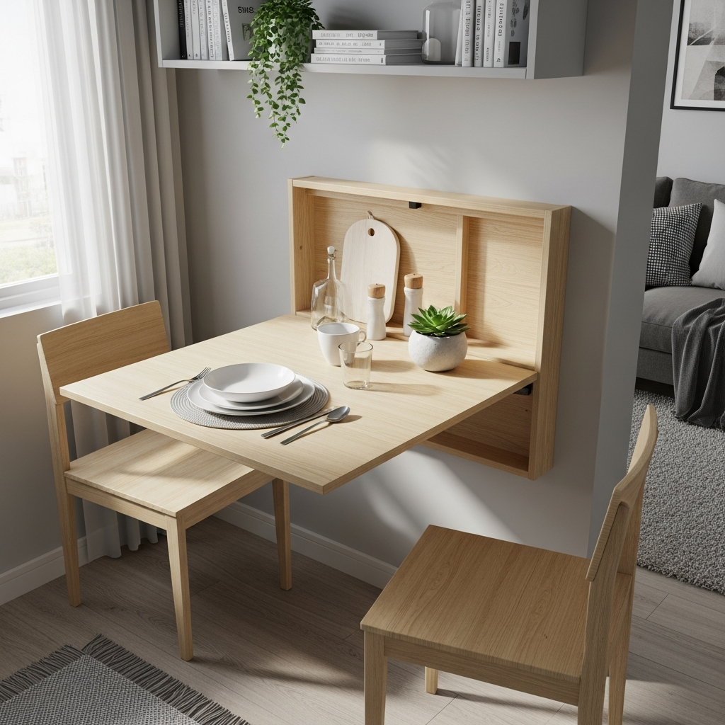 Opt for a Scandinavian-inspired wall-mounted table in a light ash wood. When not in use, it folds flat against the wall, virtually disappearing. For meals, it easily folds down, providing a sturdy surface for two, creating a cozy and functional dining nook with simple, clean aesthetics.