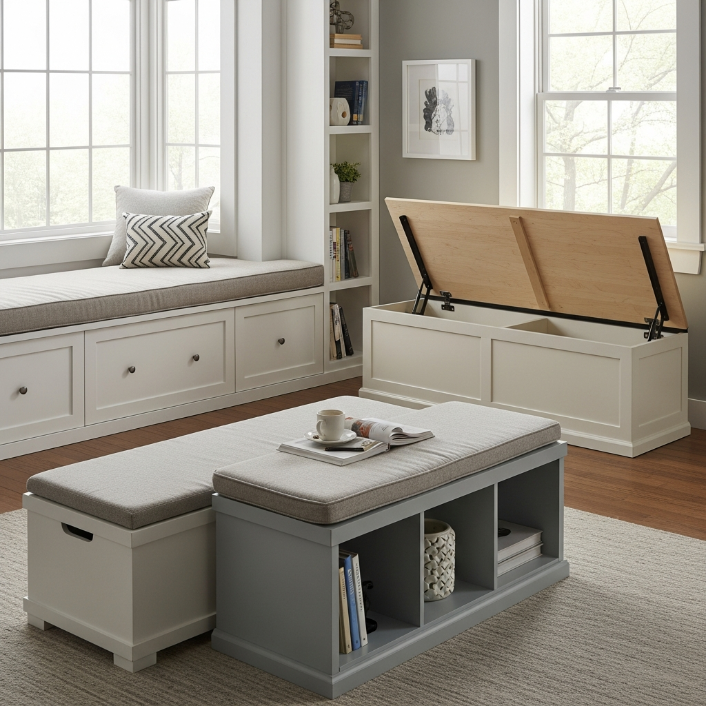 A storage bench or a custom window seat can offer seating, storage, and a cozy nook all in one. These pieces often fit snugly against a wall or under a window, maximizing unused spaces.