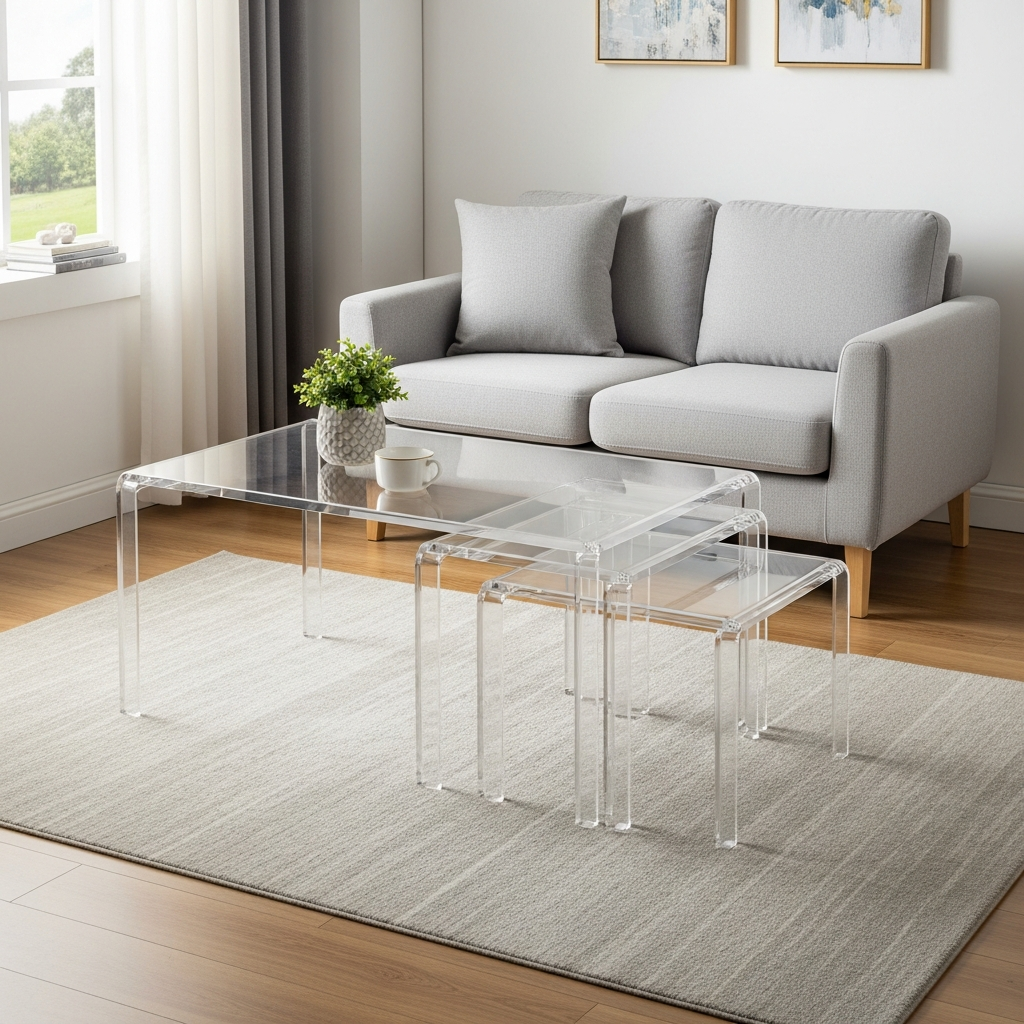 Envision a clear acrylic coffee table taking center stage in your studio. It holds a single, sculptural vase without obstructing the view of your rug or floor, contributing to an airy, contemporary feel. The “lightness” of the material creates a sophisticated and spacious illusion.