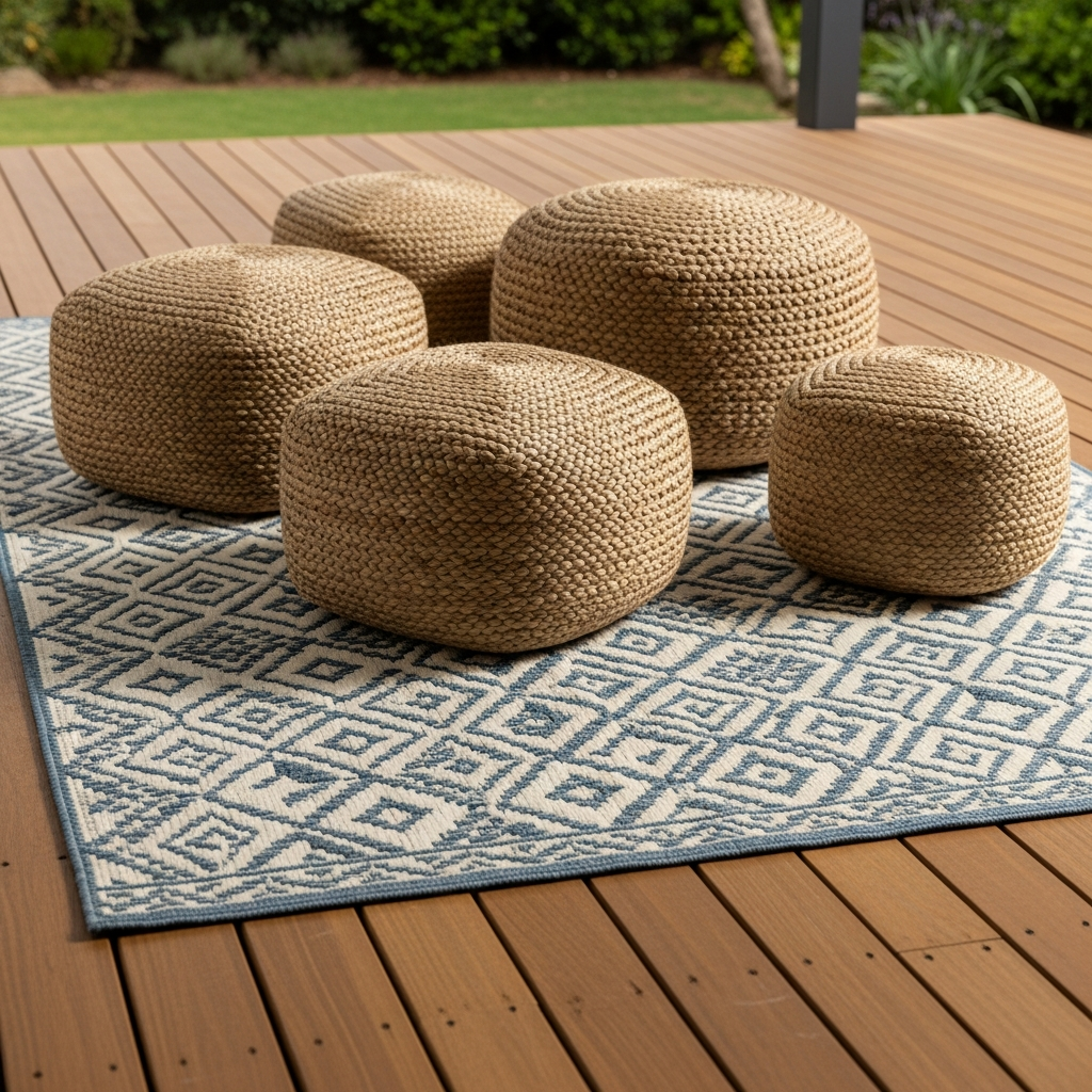 Outdoor rugs and floor poufs add texture and warmth to hard surfaces like concrete or wood decking. Choosing patterns inspired by bohemian or Moroccan designs can soften the overall look of your furniture. Ensure these items are specifically rated for outdoor use to prevent mold and fading.