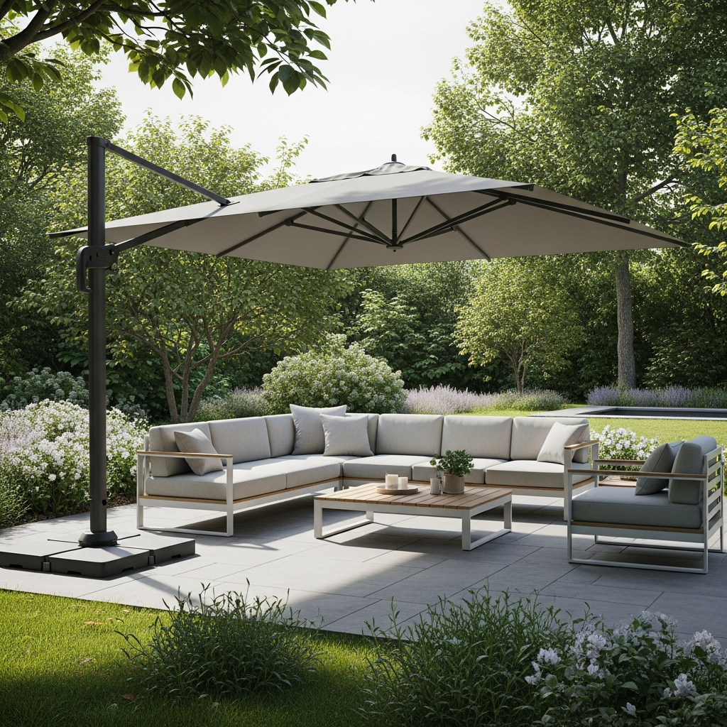 A large cantilever umbrella offers adjustable shade without the obstruction of a central pole. This allows for unobstructed views and more flexible furniture placement. Choose a model with a heavy base and UV-protective fabric to ensure safety and longevity during peak summer sun.